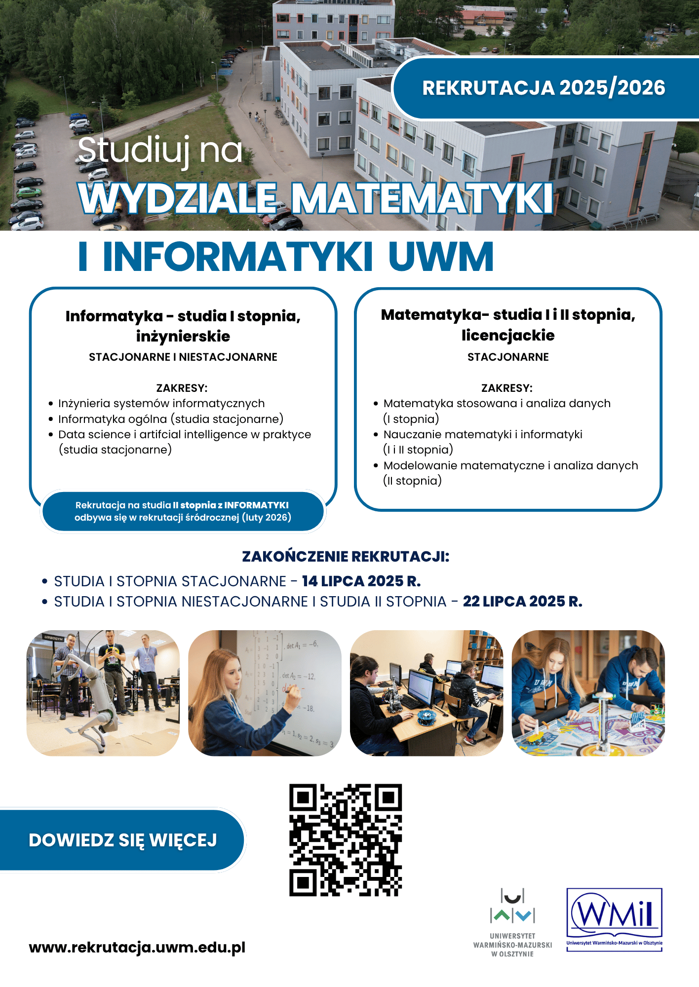 6 czerwca 2025 r. rozpoczęła się rekrutacja na studia na Wydziale Matematyki i Informatyki Uniwersytetu Warmińsko-Mazurskiego w Olsztynie. To świetna okazja, aby dołączyć do akademickiej społeczności, która łączy pasję do nauki z praktycznym podejściem do rozwoju zawodowego.