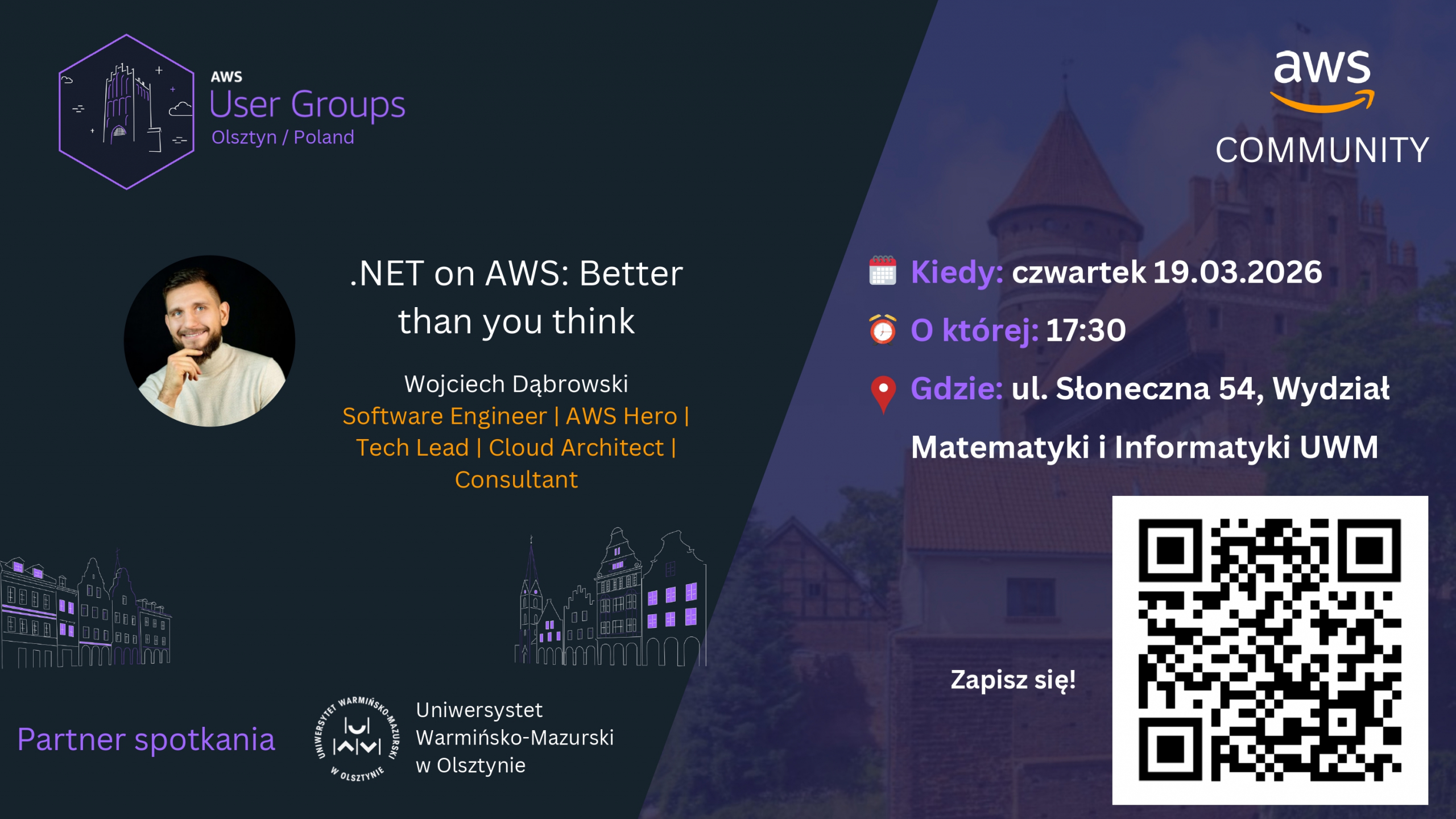 Zapraszamy na spotkanie Olsztyn AWS User Group, które odbędzie się w najbliższy czwartek (19.03.2026) w auli C0/2. Start: godzina 17:30. Prelegentem będzie Wojciech Dąbrowski a temat, który zostanie poruszony, to ".NET on AWS: Better than you think".