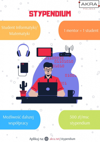 AKRA Polska uruchomiła Program Stypendialny skierowany do studentów kierunków Informatycznych i Matematycznych. Akcja głównie jest nastawiona na studentów III, IV i V roku, ale nie wykluczona jest też możliwość współpracy z osobami na pierwszych latach studiów. AKRA Polska oferuje stypendium 500zł/miesiąc, naukę pod okiem doświadczonego programisty oraz dla najlepszych możliwość nawiązania współpracy po skończonym programie.