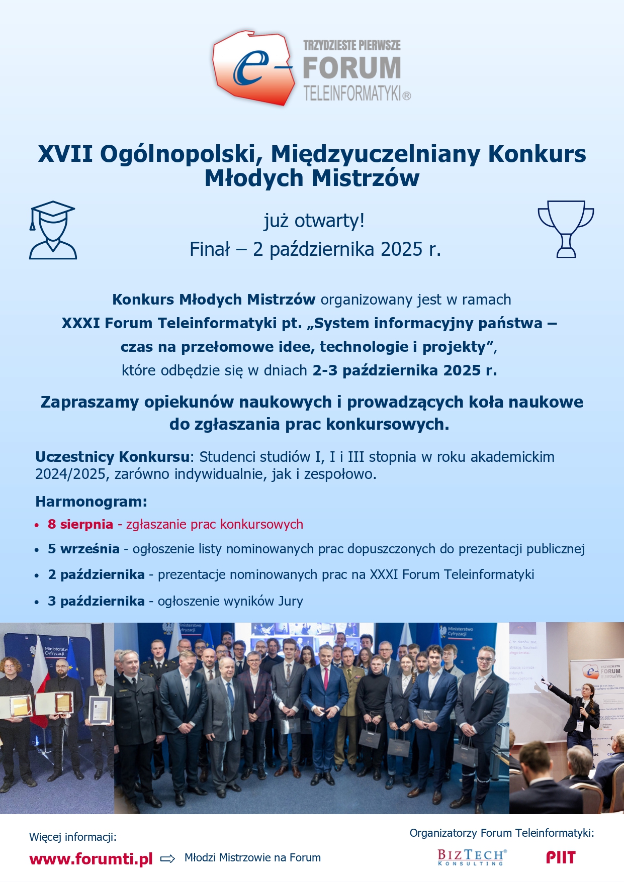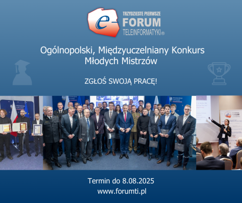 Konkurs Młodych Mistrzów organizowany jest w ramach XXXI Forum Teleinformatyki pt. „System informacyjny państwa – czas na przełomowe idee, technologie i projekty”, które odbędzie się w dniach 2-3 października 2025 r. Zapraszamy opiekunów naukowych i prowadzących koła naukowe do zgłaszania prac konkursowych.