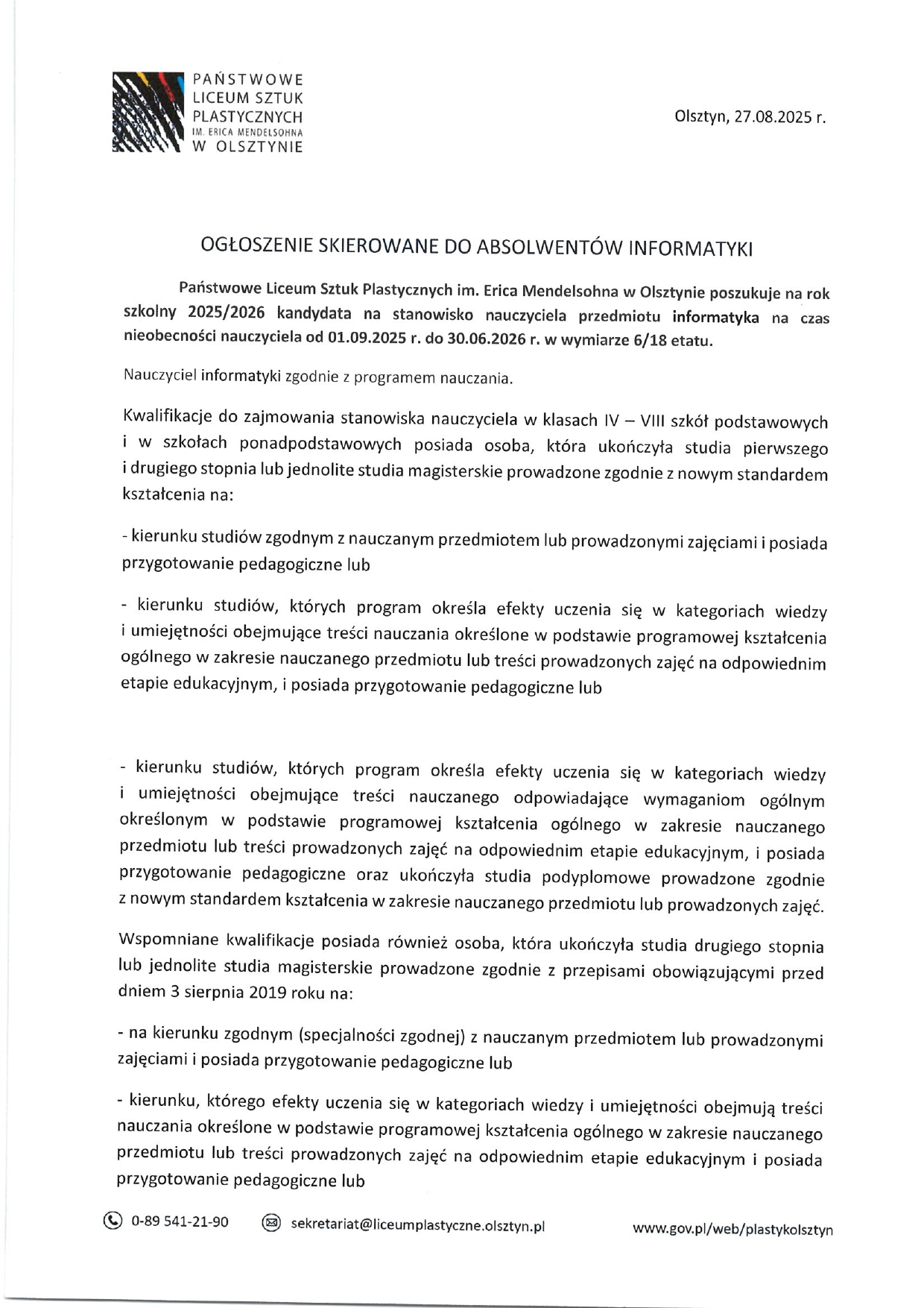 Liceum Sztuk Plastycznych im. E. Mendelsohna w Olsztynie poszukuje nauczyciela informatyki na rok szkolny 2025/2026.