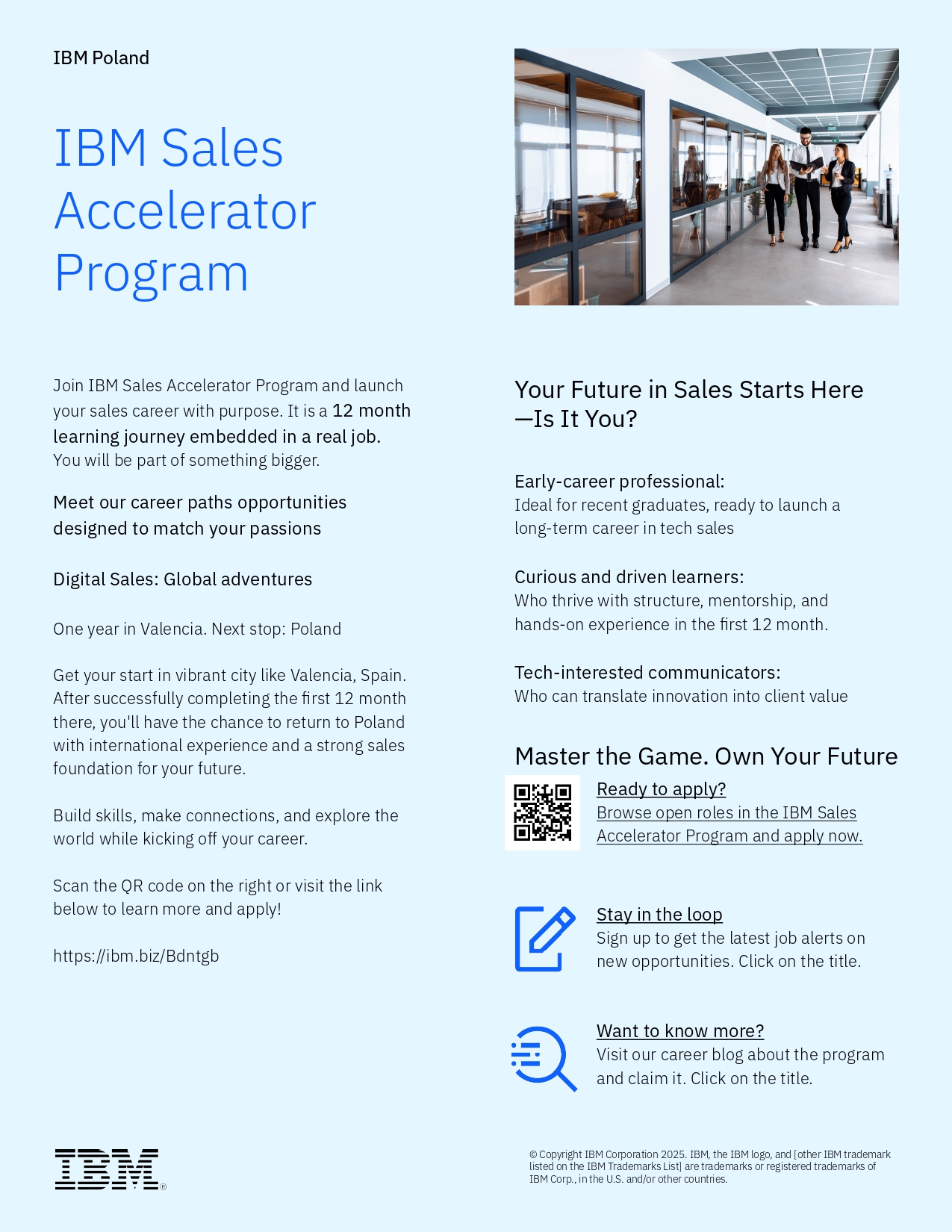 Po pomyślnym ukończeniu rocznego stażu w Hiszpanii, wrócisz do Polski z międzynarodowym doświadczeniem i solidnymi podstawami sprzedażowymi na przyszłość oraz będziesz mieć szansę rozpocząć pracę w IBM Polska.